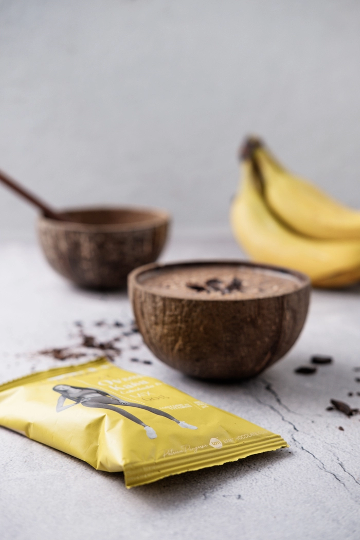 Ovseni kosmiči 55 %, koncentrat sirotkinih beljakovin 28,9 %, koruzni škrob, modificiran koruzni škrob, čokolada 2,5 % (sladilo: D-maltitol, kakavovo maslo, kakavova masa, manj masten kakav v prahu, emulgator sončnični lecitin, izvleček burbonske vanilije), liofilizirana banana 1 %, manj masten kakav v prahu (10-12%), arome, sol, vitaminski kompleks (C, E, B1, B2, B5, B6, B9, B12, niacin, biotin), sladilo (sukraloza). Kakavovi deli najmanj 54 %.