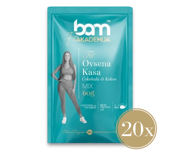 FIT Zajtrk, Čokolada in kokos, vsebuje 20 kosov BAM Oatmeal z okusom čokolade in kokosa. BAM Oatmeal s čokolado in kokosom (60 g) predstavlja izvrsten proteinski obrok, ki zagotavlja esencialne beljakovine za podporo aktivnemu življenju. Uživajte v tej ovseni kaši z okusi čokolade in kokosa in si jo privoščite kot bogat zajtrk, poživljajoč obrok po vadbi ali kot okusno opoldansko malico.