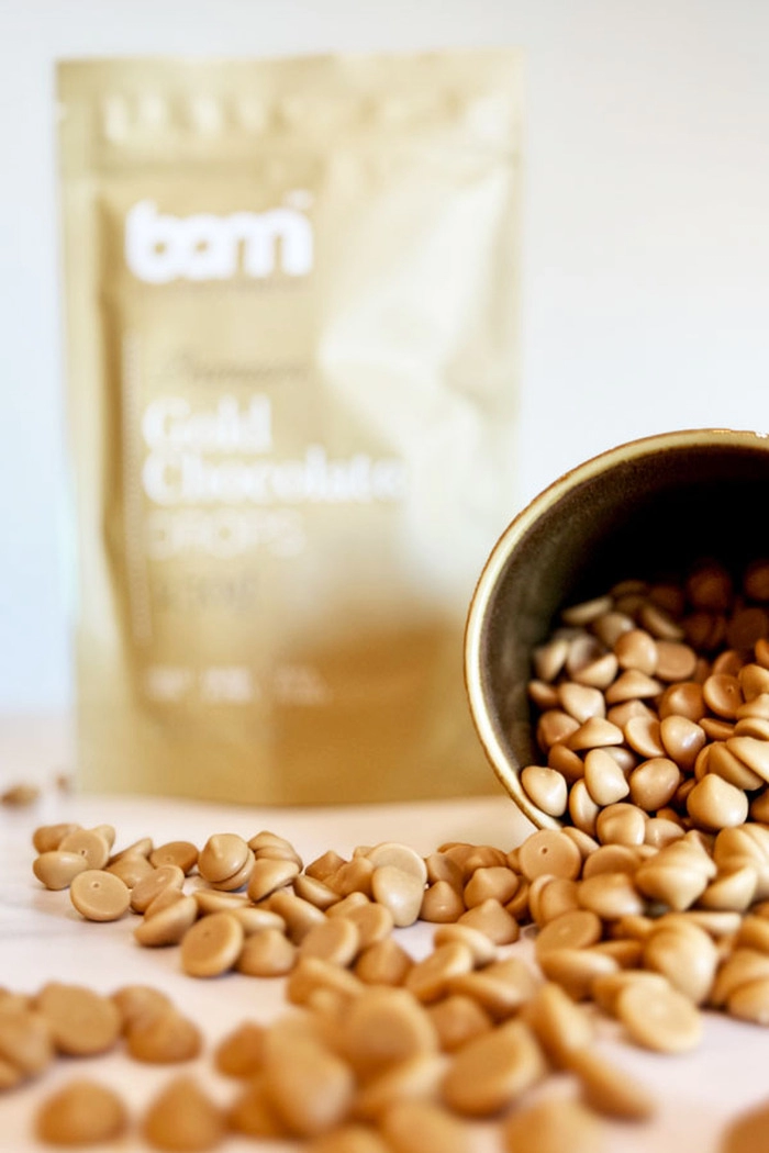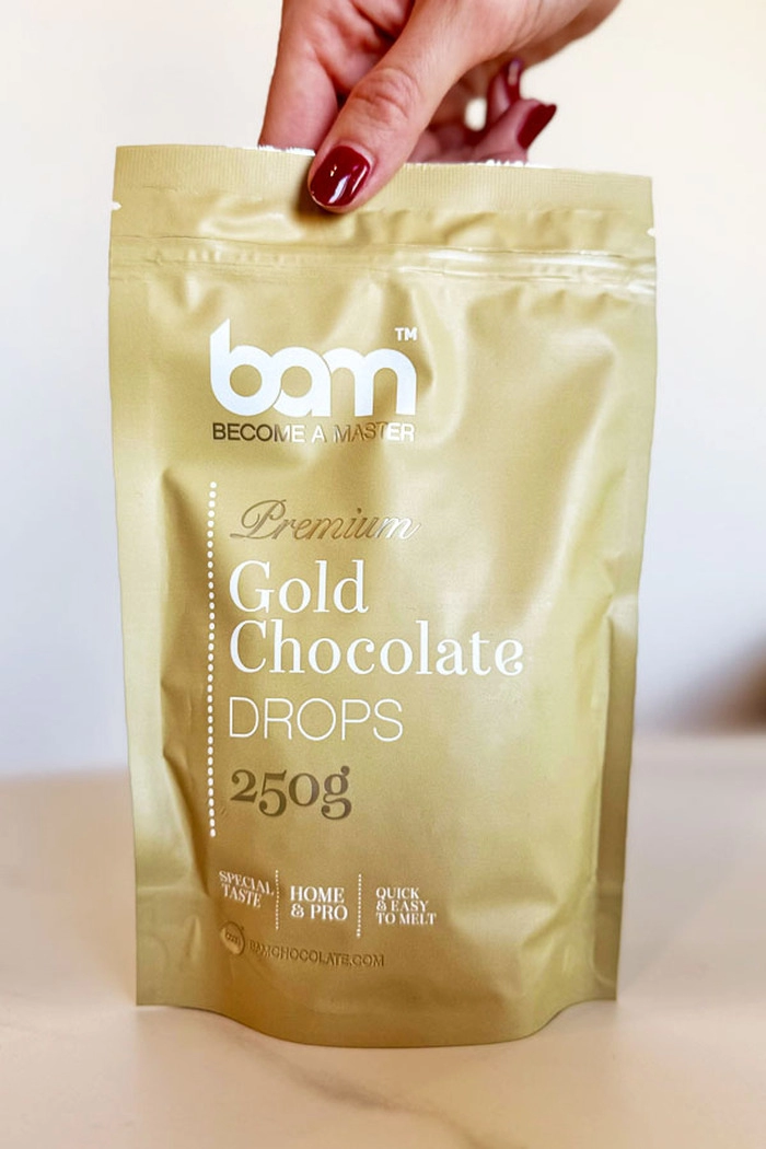 BAM GOLD čokolada je prestižna bela čokolada, obogatena s karamelo in karameliziranim mlekom. Njen okus je izrazito karamelni, z izjemno kompleksnimi notami toffeeja, masla, smetane in subtilnim pridihom soli. Zaradi zlatega odtenka boste s to BAM čokolado ustvarili raznolike in osupljive sladice. Ta čokolada je oblikovana v majhne kapljice, kar omogoča hitro in enakomerno taljenje. Uporabna je za pripravo različnih krem, moussejev, prelivov, ganašev, sladoledov, piškotov in raznolikih nadevov. Čokolada BAM GOLD ne vsebuje glutena.
