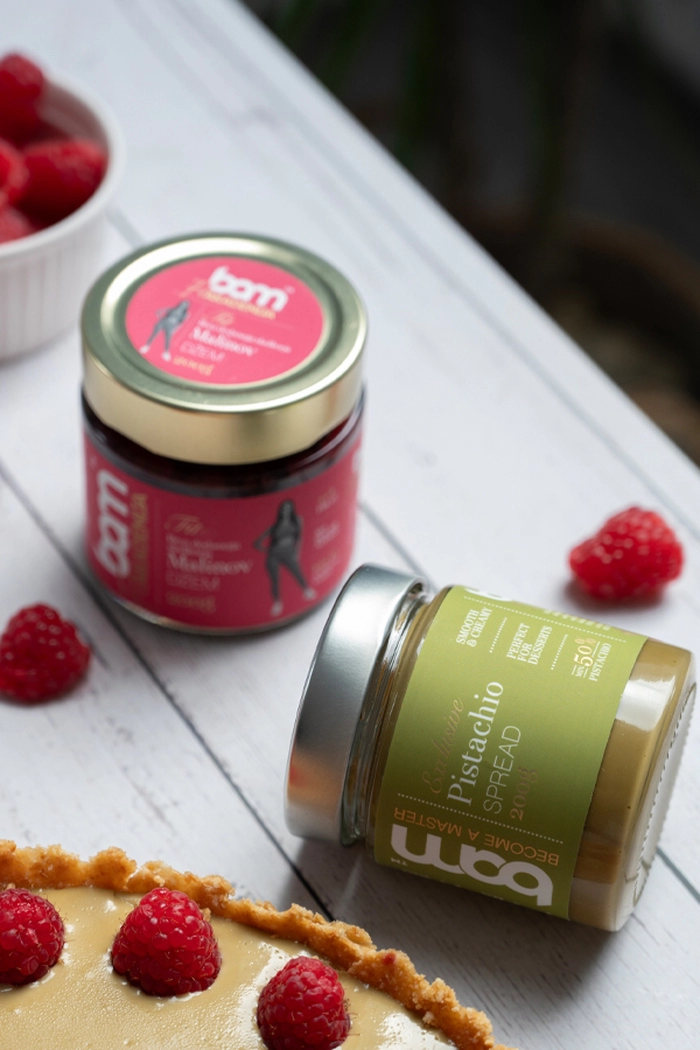 BAM Vanilijeva pasta iz bourbonske vanilije z Madagaskarja je brez alkohola ter obogati okus in izgled vsake jedi. Zaradi praktičnega pakiranja v tubi, je pasta vedno sveža, njeno doziranje pa natančno. BAM Pistacijev namaz je znan po svoji kremasti teksturi in pristnem pistacijevem okusu. BAM Malinov džem brez dodanega sladkorja je poln antioksidantov, ki razvajajo brbončice s svežim okusom, hkrati pa telesu zagotavljajo vlaknine in vitamine, BAM Bela čokolada
