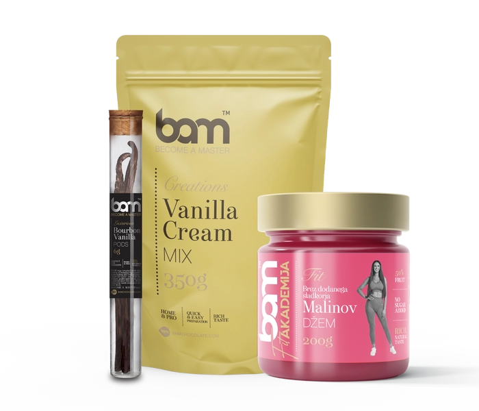 Ustvarili smo paket izdelkov, s katerimi lahko pripravite sočno in okusov polno vanilijevo torto z malinami. BAM mešanica za vanilijevo kremo, BAM vanilijevi stroki in BAM preliva malina tako ustvarijo kombinacijo okusov, s katerimi res ne morete zgrešiti. Postanite mojster slaščic z nami!