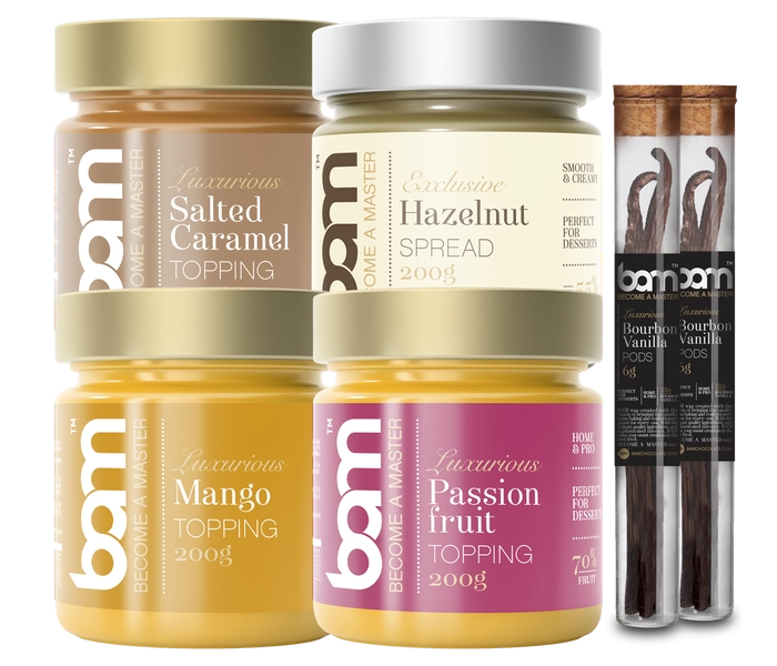BAM izdelki za peko tokrat stopijo ob bok priznanega slaščičarskega mojstra in italijanskega zmagovalca Masterchef oddaje. Antonio Colasanto svoje sladice ustvarja z BAM vanilijevimi stroki (6 g), prelivi mango (200 ml), slana karamela (200 g) in pasijonka (200 ml). Doda še lešnikov namaz (200 g) iz izvrstnih lešnikov iz Piemonta, ki se odlično podajo k vsem sladicam. Vanilijevi stroki sladicam izpod rok Masterchef zmagovalca poskrbijo za privlačen izgled, sadni prelivi za okus, slana karamela pa s svojim razkošnim okusom obogati vsak slaščičarski krožnik. Lešnikov namaz pa modernim sladicam doda piko na i.