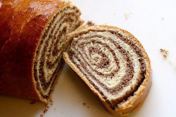 Vzhajano testo razvaljajte in premažite z nadevom. Zvijte in položite na pekač, obložen s papirjem za peko.