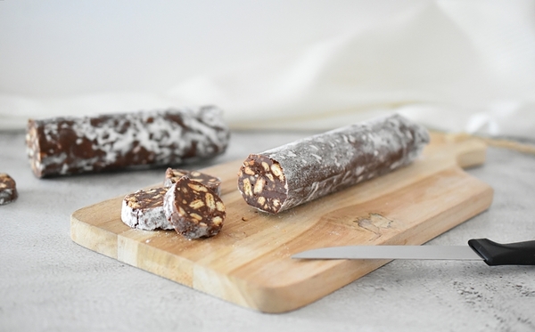 Sestavine recepta zadostujejo za dve čokoladni salami. Recept je del BAM knjige receptov: Sladki prigrizki.