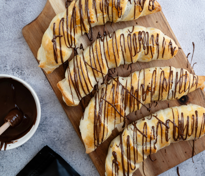 Predstavljamo ti recept za slastne pečene banane, ovite v hrustljavo listnato testo. V notranjosti se skriva BAM lešnikov proteinski namaz s kakavom, ki bananam doda bogat kremasti okus.