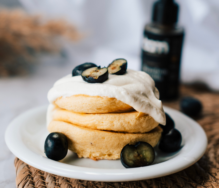 Na srednjem ognju segrej ponev in nanjo polij tri kupčke mase. Dodaj nekaj kapljic vode in hitro pokrij s pokrovko. Palačinke pečeš približno 3-4 minute na eni strani, da postanejo lepo zlatorjave ter se na vrhu pojavijo mehurčki.Ko so palačinke pečene, jih postrežeš s stepeno smetano in svežimi borovnicami. Uživaj v njihovi nežni teksturi in slastnem okusu vanilije!