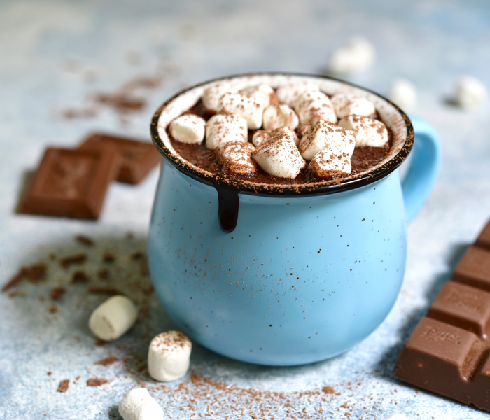 K vroči čokoladi lahko dodamo še mini marshmallow penice, vanilijevo ali lešnikovo pasto in postrežemo.