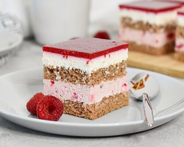 Mlačen malinov pire enakomerno prelijemo po kremi. Pecivo ohlajamo vsaj 6 ur, nato ga narežemo na kocke in poljubno dekoriramo.