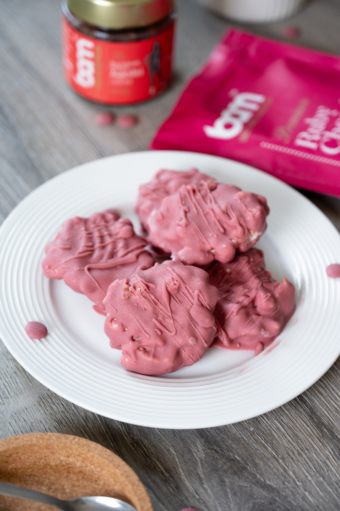 Naša izbira za čokoladno oblogo je BAM Ruby čokolada, prava inovacija na področju čokolade. Ruby čokolada se ponaša z edinstveno rožnato barvo, doseženo brez dodanih barvil, zahvaljujoč posebni sorti kakavovih zrn, ki rastejo v Ekvadorju, Braziliji in na Slonokoščeni obali. Njena naravna barva in izjemen okus združujejo kremastost z rahlo kiselkastim, jagodičevju podobnim okusom. Oblika manjših kapljic omogoča hitro in enostavno topljenje ter natančno doziranje, kar zagotavlja popolno oblogo za naše zamrznjenčke.