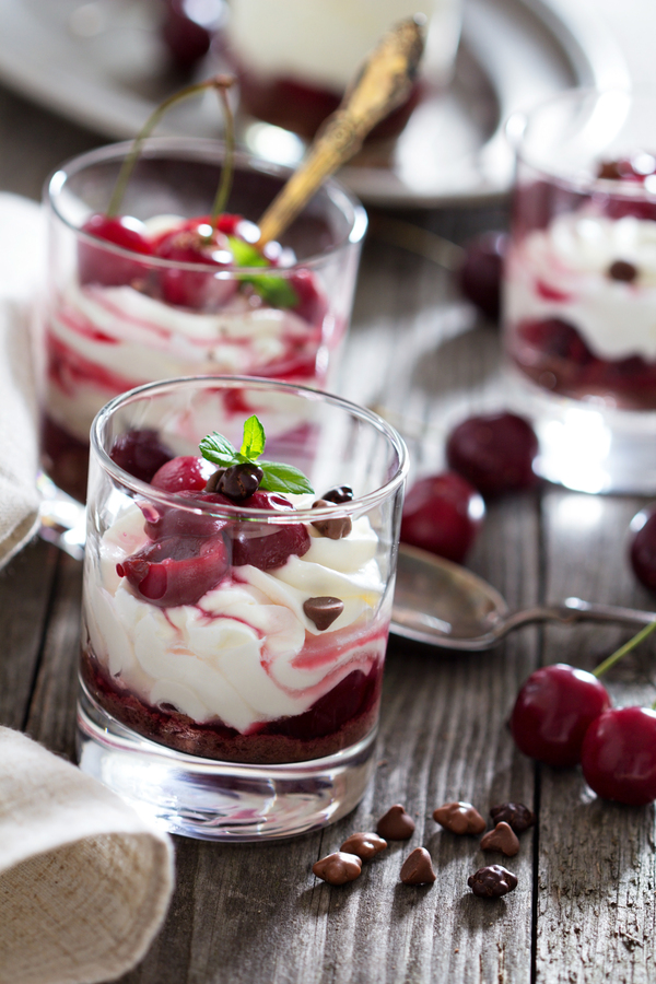 Črni gozdiček je sladica v kozarcu, ki navduši s plastmi bogate čokoladne pene, sočnega višnjevega kompota in sveže stepene smetane.