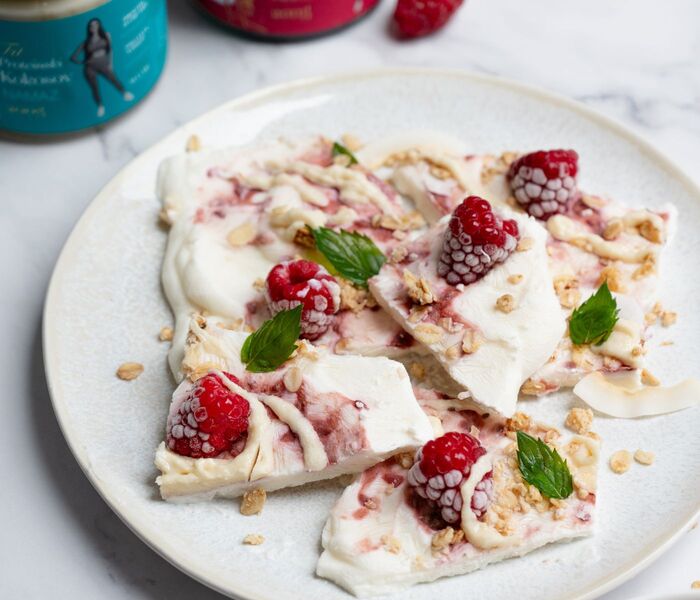 Predstavljaj si kremasto teksturo grškega jogurta, ki se prepleta s sladkostjo medu, vse skupaj pa je zamrznjeno do popolnosti. Osnova za našo zamrznjeno jogurtovo tablico je preprosta, a čarobnost tega prigrizka je v možnostih dodatkov, ki jih lahko vključimo. Eden izmed najljubših dodatkov je BAM malinov džem brez dodanega sladkorja, ki s svojo intenzivno aromo in rahlo kislostjo lepo dopolnjuje blag okus jogurta. Sveže sadje, kot so sočne maline, doda svežino in sočnost, medtem ko BAM kokosov beljakovinski namaz prinese eksotičen pridih in bogato kremasto teksturo.